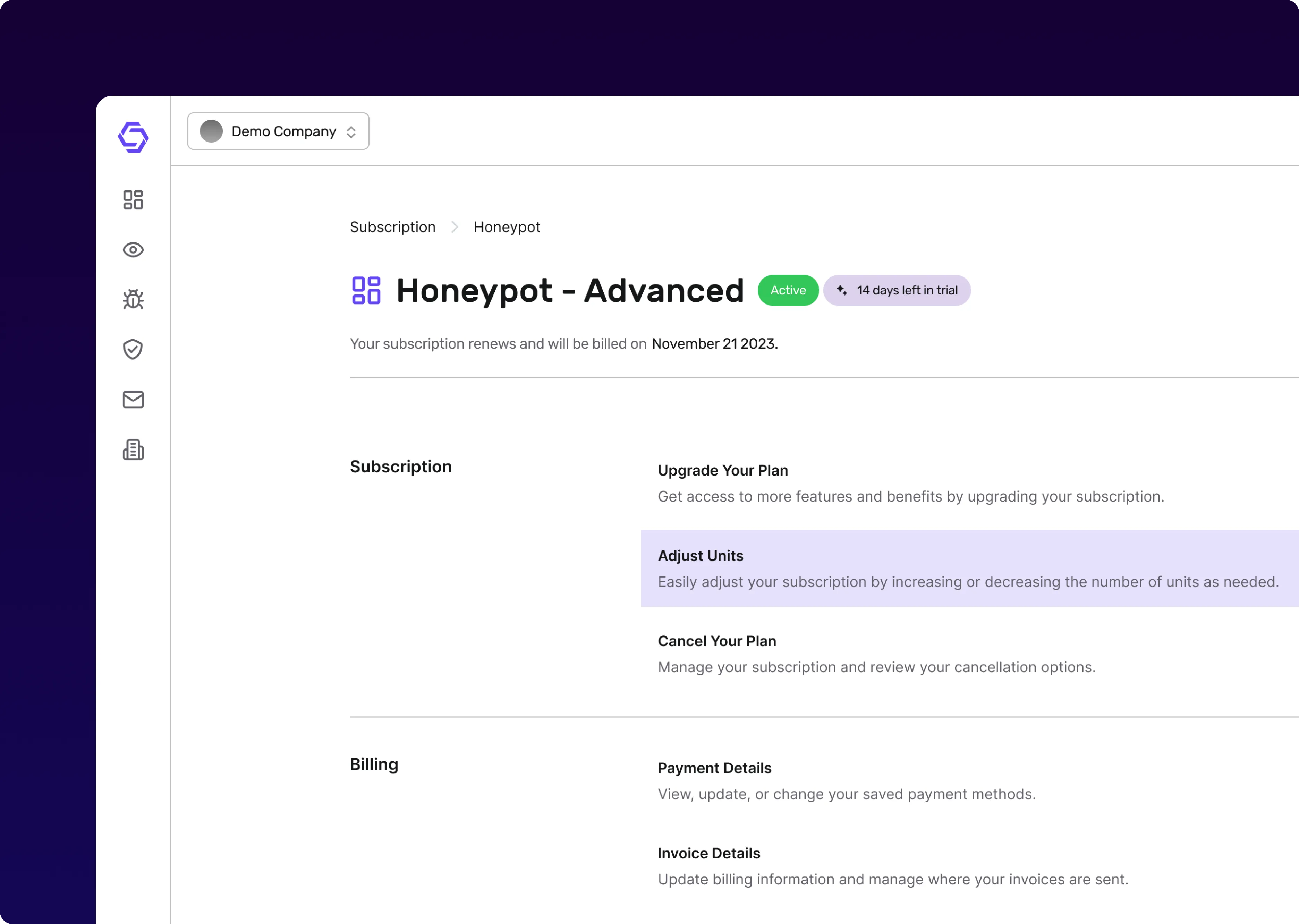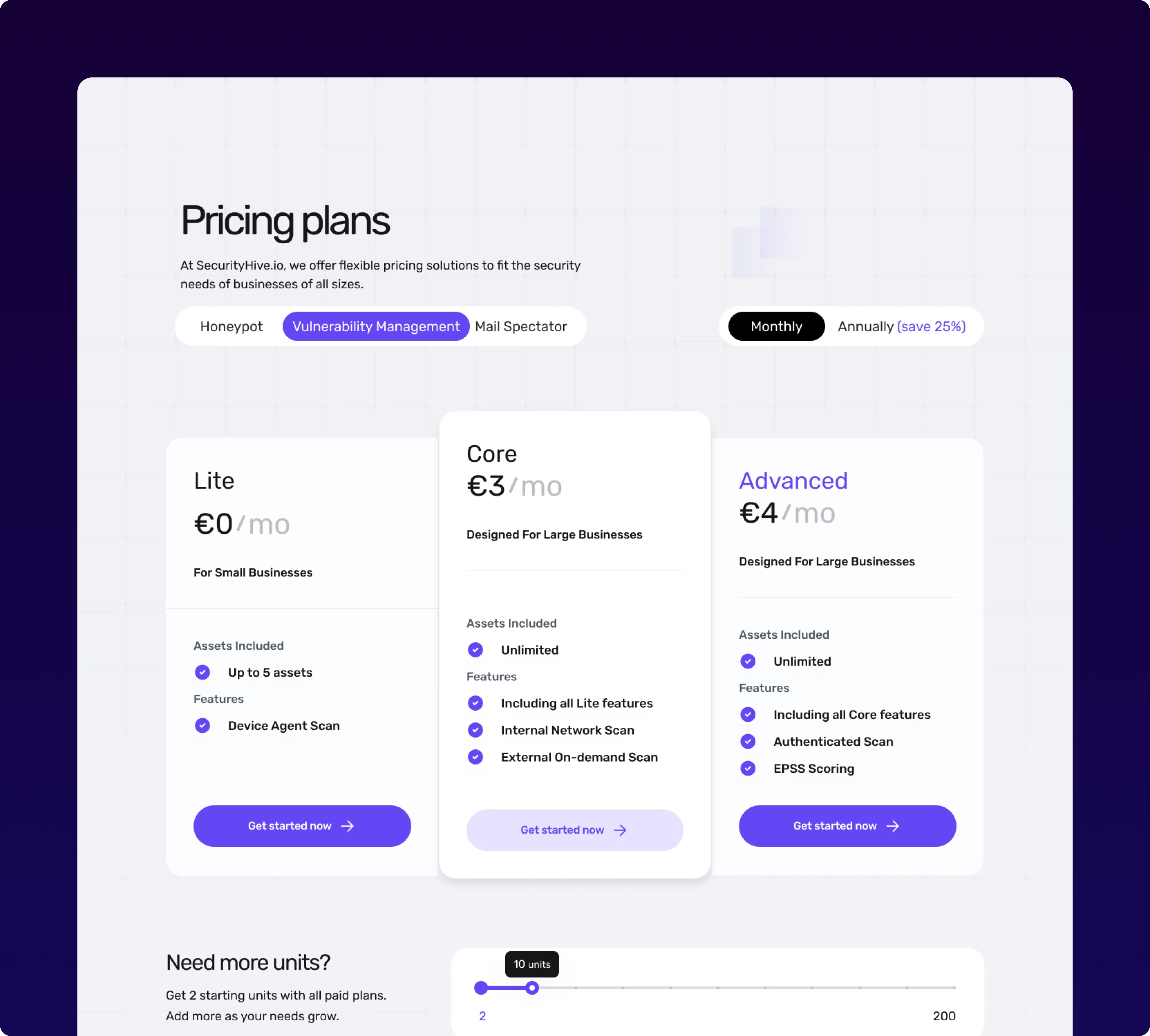 Nobody wants to fight with subscription management when they should be focusing on security. We designed SecurityHive's billing system to be as straightforward as possible - users can upgrade plans, add or remove coverage units, and handle payments without any headaches. Everything important is right where you'd expect it, so businesses can scale their protection up or down as needed and get back to work.